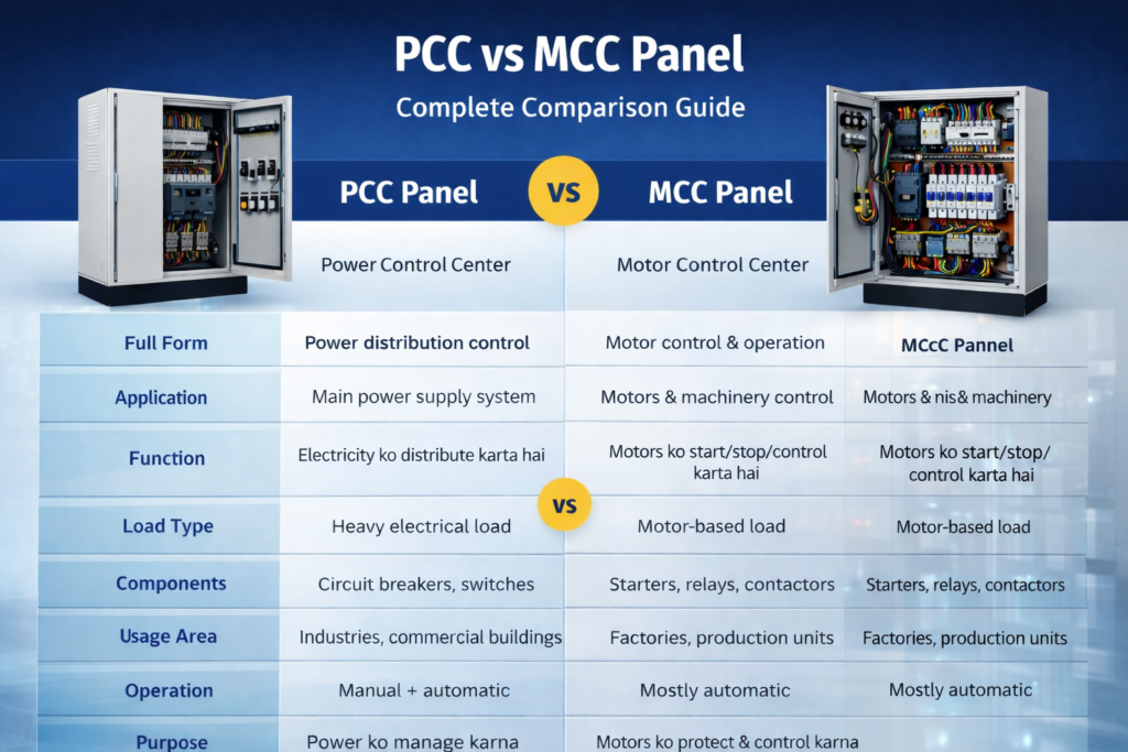PCC Panel mainly power ko control aur distribute karne ke liye use hota hai, jabki MCC Panel motors ko operate aur control karne ke liye design hota hai. Dono panels industrial electrical systems me important role play karte hain, lekin unka use aur function alag hota hai.